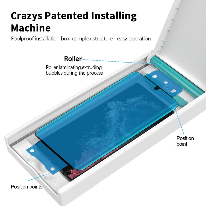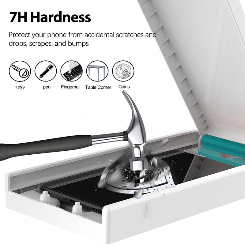 Det självjusterande skärmskyddsfodralet gör att du enkelt kan installera den keramiska laminatfilmen utan att skapa bubblor och ta bort rester. Den fäster på telefonens skärm utan luckor eller bubblor, så den påverkar inte beröringskänsligheten.