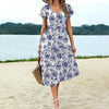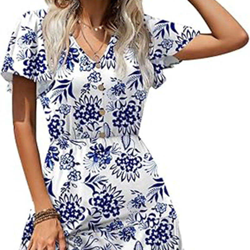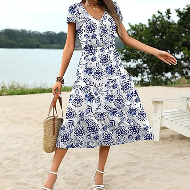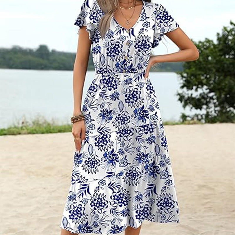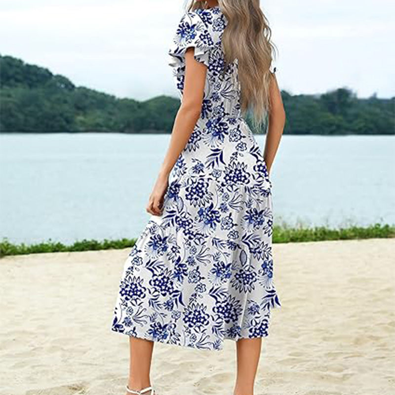 SMICKRANDE FLÖDANDE PASSFORM – Designad med en avslappnad, flödande silhuett som följer dina kurvor utan att sitta åt. V-ringningen och de korta ärmarna tillför en feminin touch, medan den långa längden säkerställer graciös rörelse. Oavsett om du går genom staden eller slappar vid stranden, framhäver denna klänning din naturliga form.