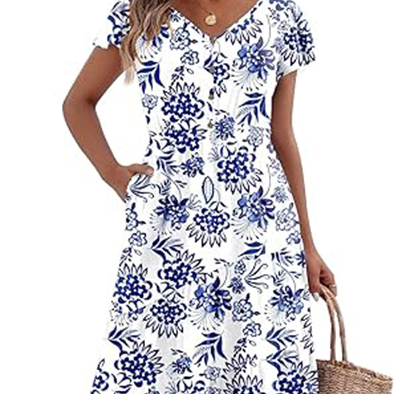 Avslappnad kortärmad V-ringad flödande lång klänning med fickor för kvinnor