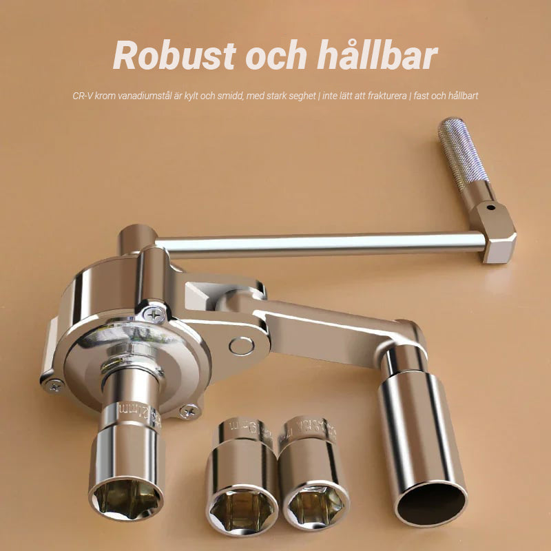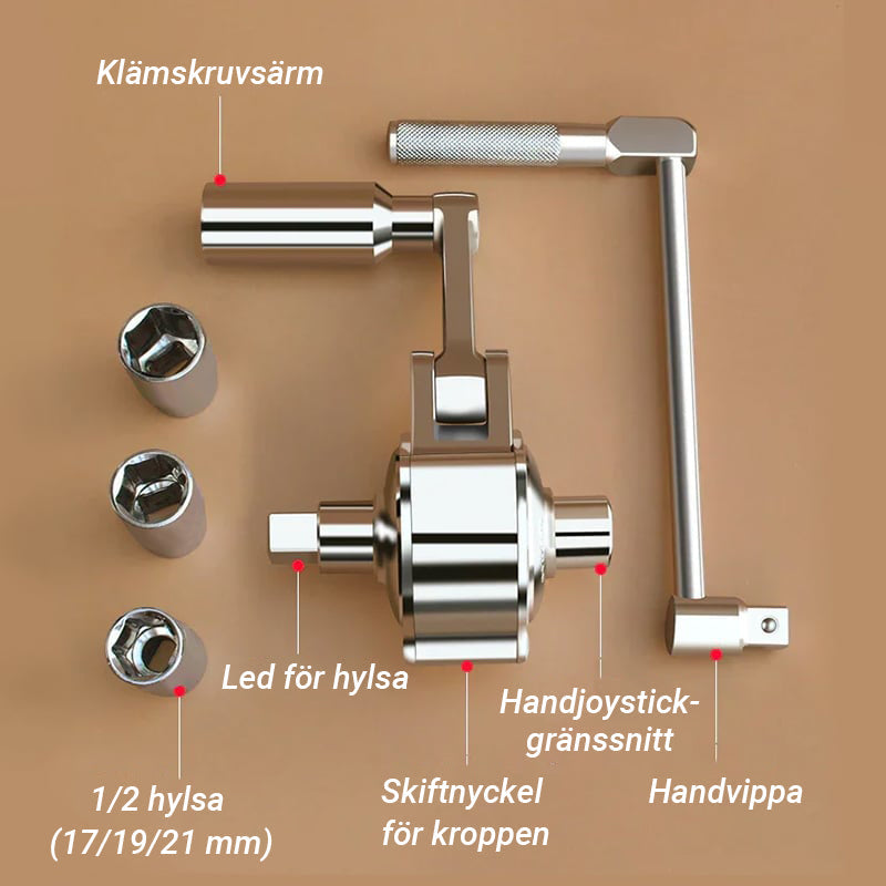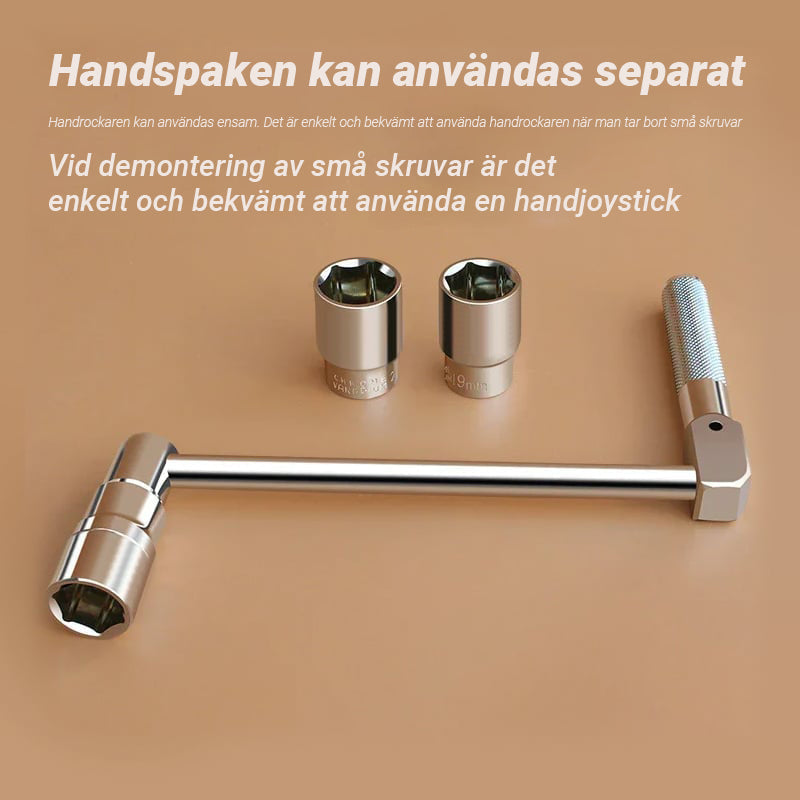 - Enkel att anvÀnda - anslut bara vevhandtaget och skjut den andra fasta hylsan pÄ nÀrmaste mutter för att fÄ en stabil stödposition. Börja lossa dessa muttrar och anvÀnd handjoysticken nÀr du demonterar den lilla skruven. Handjoysticken kan anvÀndas ensam, enkelt och bekvÀmt