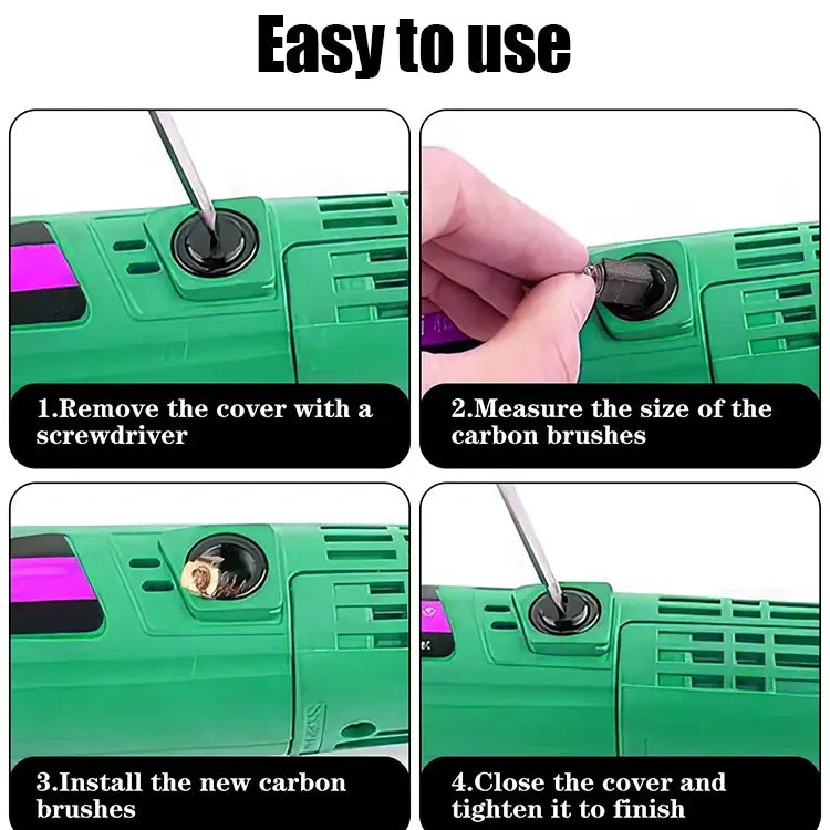 PERFEKT KOMPATIBILITET – Universell design passar de flesta märken (Makita, Bosch m.fl.)! Flexibla kopparflätor säkerställer sömlös kontakt med kommutatorer. Inget gissande – återuppliva vinkelslipar, cirkelsågar och slipmaskiner på några minuter.