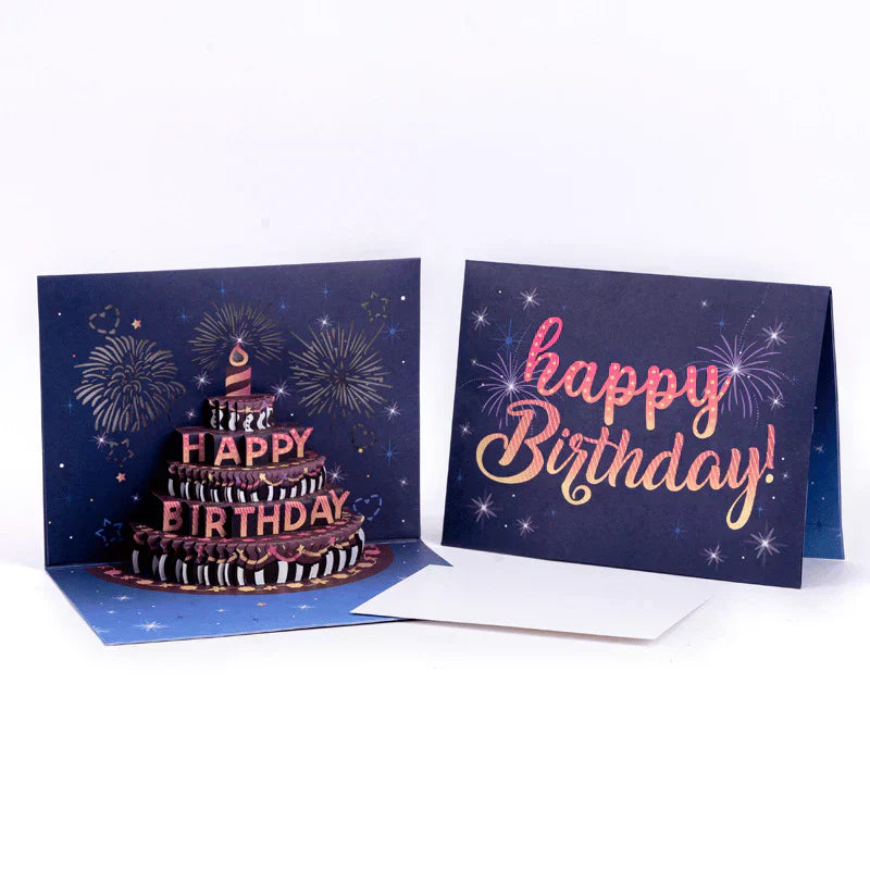 đFyrverkeripop-up-tĂ„rta med ljus och musik, födelsedagskortpresent