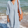 Sommarklänning i bomull och linne med V-ringning för kvinnor