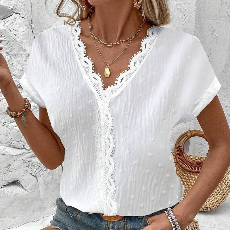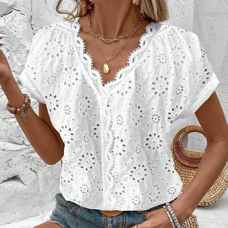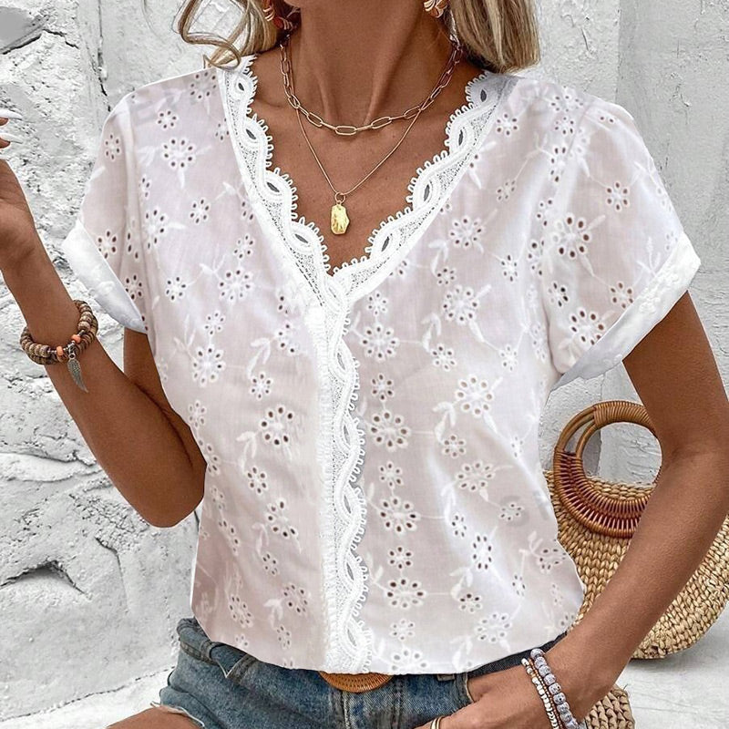 Elegant vit spets V-hals kortärmad topp