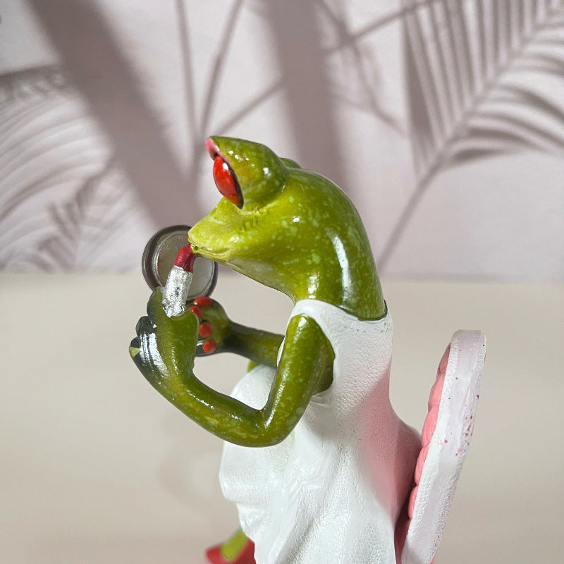CHARMIG GRODA: Denna distinkta groda har en fantasifull design och föreställer en groda som elegant sitter på en stol och målar läppar. Den är klädd i högklackade skor och klänning och har ett lekfullt men sofistikerat utseende som ger en unik charm till alla rum.