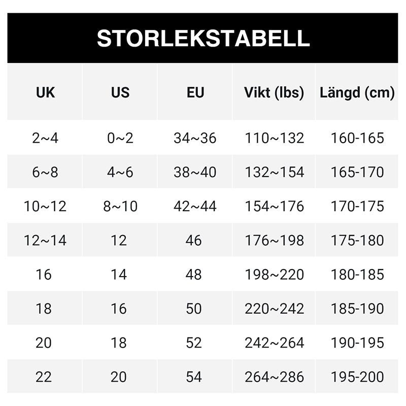 Storlekar: S(45-50kg),M(50-57.5kg),L(57.5-65kg),XL(65-72.5kg),2XL(72.5-80kg),3XL(80-87.5kg),4XL(87.5-95kg),5XL(95-105kg)