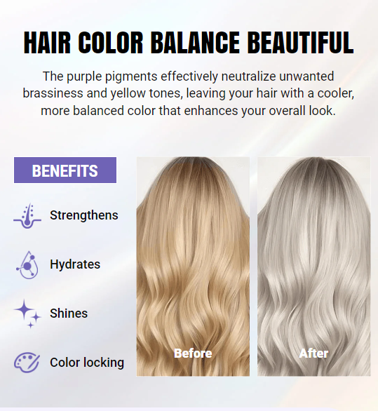 NEUTRALISERING AV GULA OCH VARMA TONER: De lila pigmenten neutraliserar effektivt oönskade gula och varma toner, vilket ger ditt hår en kallare och mer balanserad färg som förstärker ditt utseende.
