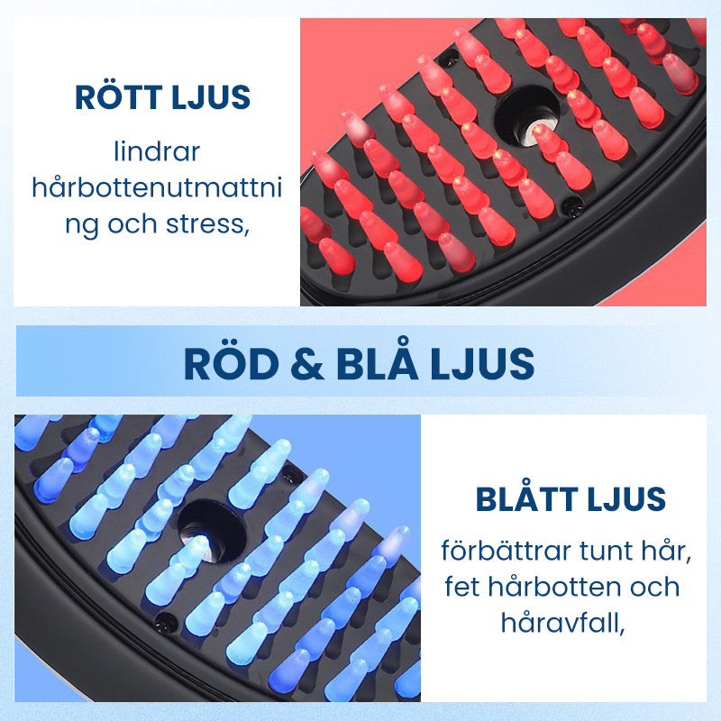RÖD & BLÅ LJUS: Rött ljus lindrar hårbottenutmattning och stress, medan blått ljus förbättrar tunt hår, fet hårbotten och håravfall, vilket främjar övergripande hårbottenhälsa.