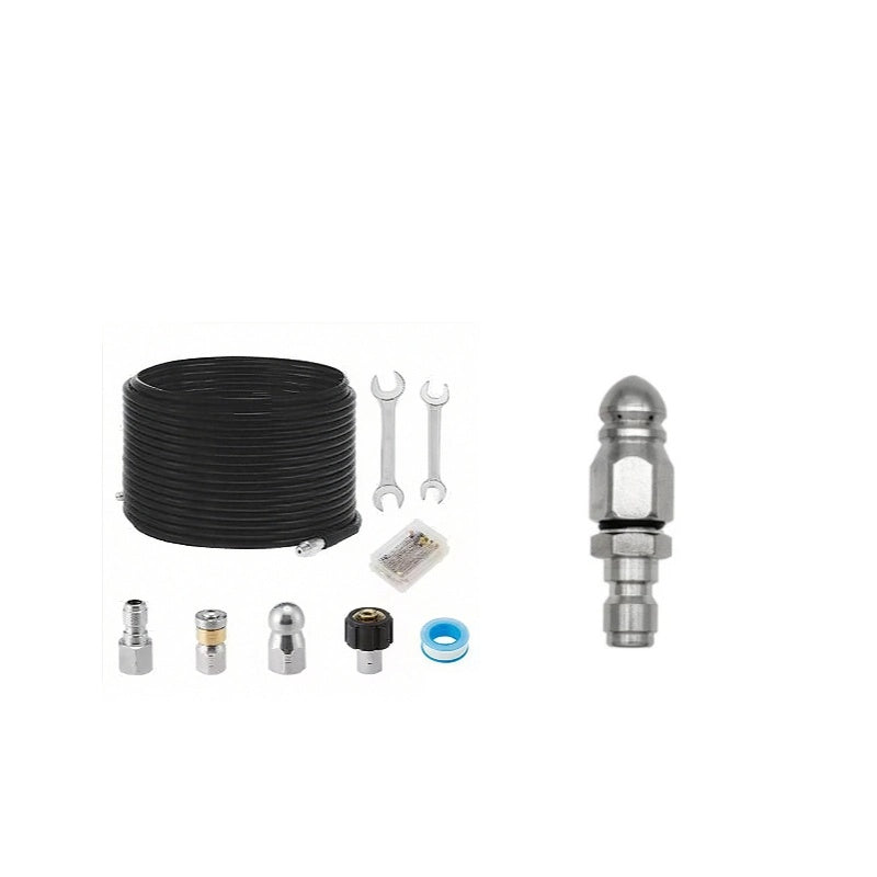 KOMPLETT AVLOPPSSPOLNINGSSATS – Innehåller alla nödvändiga tillbehör för omedelbar användning, såsom munstycken, kopplingar och en kraftig slang, vilket gör den till en komplett lösning för alla dina behov av avlopps- och rörrengöring.