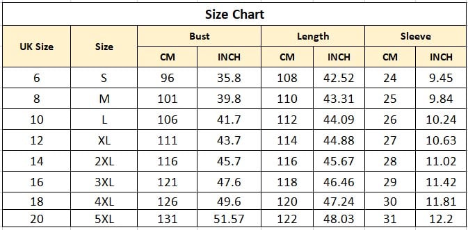 | Storlek (cm) | UK | Längd | Byst | Ärmar |