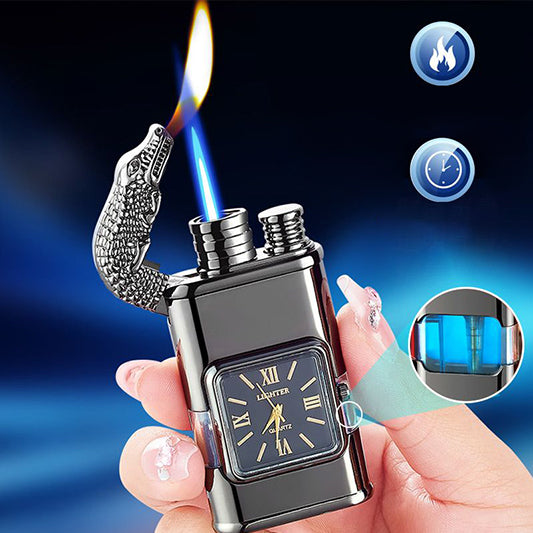 KREATIVT DESIGN MED DUBBLA FLAMMOR: Den majestätiska och dominanta örnshuvudformade designen är väldigt cool. Den Vintage Klocka Vindtät Tändaren är extremt kraftfull så den kan användas vid många tillfällen. Tryck på knappen, torchflamman är intensiv och har en vindtät effekt. Släpp knappen, tändaren ändras till en mjukare låga. Det är så roligt och iögonfallande. Två stilar, praktiska och eleganta.